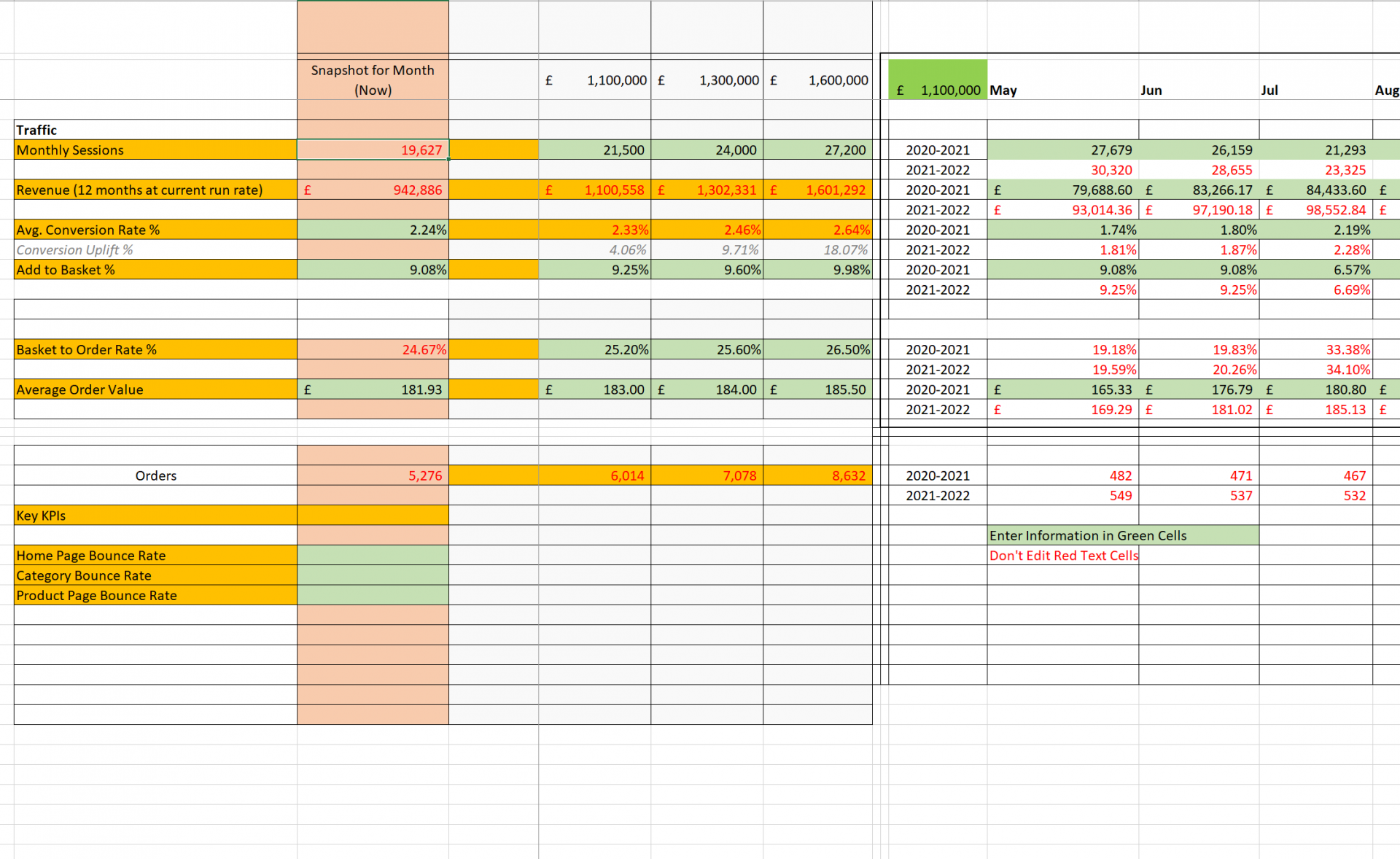 The sheet will give you 'add to basket' targets, 'basket to order' targets, 'average order value' targets and traffic targets. All seasonally adjusted for the year.